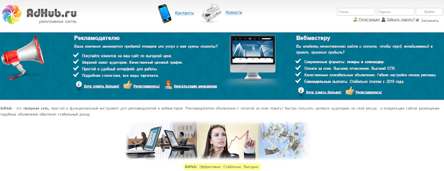 AdHub представляет из себя тизерную рекламную сеть, в котором имеется очень простой, но функциональный инструмент для вебмастеров и рекламодателей. В этом сервисе рекламодатели объявлений могут быстро получить целевой трафик на свой ресурс, а вебмастера обеспечить себя стабильным доходом за счет размещения на своих сайтах объявлений