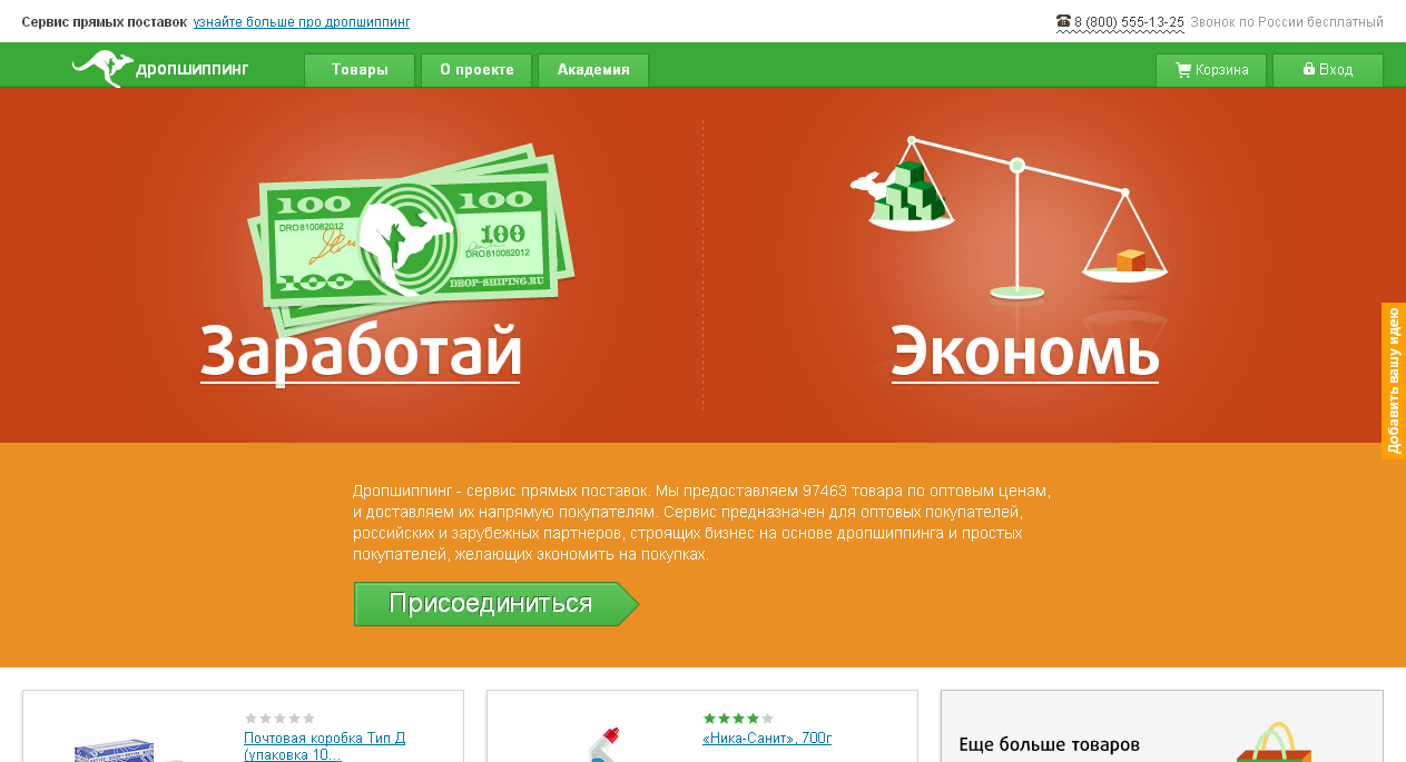 Дропшиппинг - это сервис прямых поставок различных товаров. Данный сервис предоставляет более 10.000 товаров от производителя по оптовой цене, и сам доставляет их напрямую своим покупателям. Официальный сайт Дропшиппинга специализируется на оптовых покупателях, зарубежных, украинских и российских партнеров, строящих свой бизнес на основе дропшиппинга и простых покупателей, которые желают сэкономить на своих покупках.