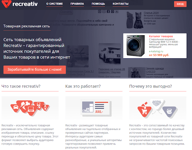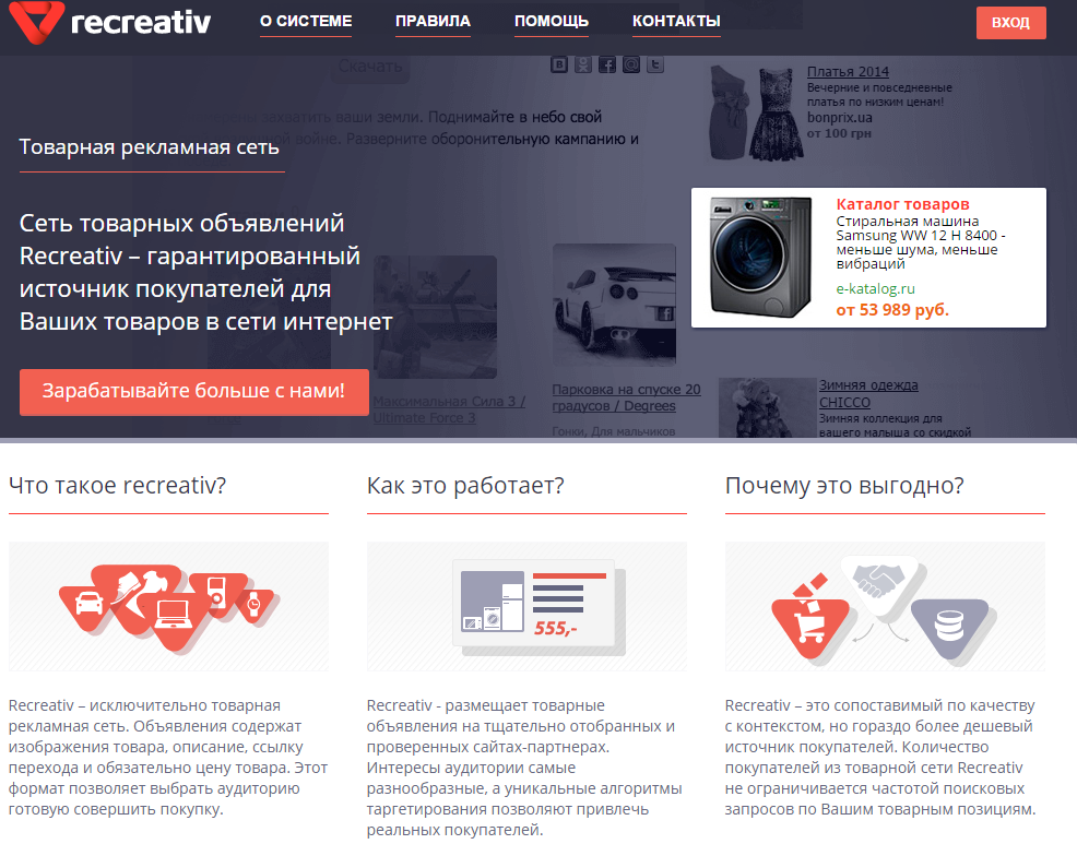 Сервис Recreativ специализируется только на товарной рекламе. Рекламные объявления состоят из изображения самого товара, его описания (цена товара обязательна), и ссылки для перехода. Благодаря этому формату, переходы осуществляет та аудитория, которая готова сделать покупку.На данный момент (июнь 2015г.) с товарной сетью уже работают более 235 интернет магазинов.