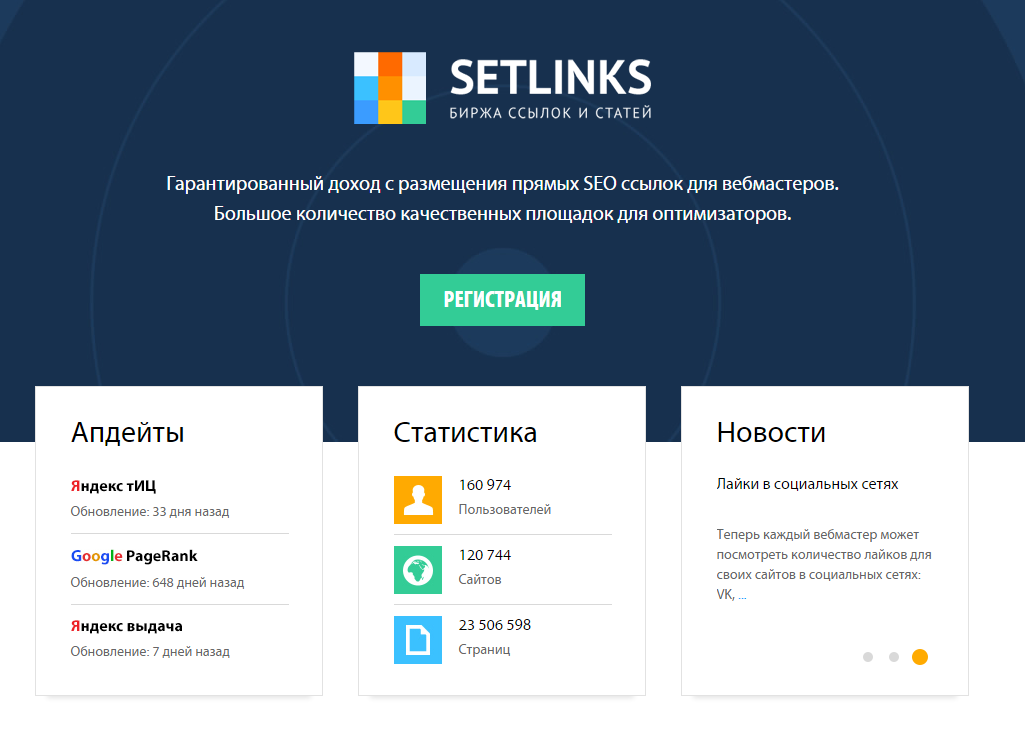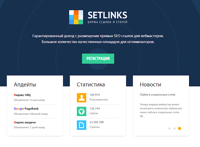 SETLINKS это Биржа ссылок, являющаяся крупным игроком в области покупки и продажи ссылок в сети.Сервис предлагает владельцам сайтов хороший способ постоянного пассивного заработка. Не зависимо от того, какая у вас посещаемость сайта, Вы можете обеспечить себе постоянный денежный доход, размещая лишь объявления, ссылки или статьи на своем ресурсе.