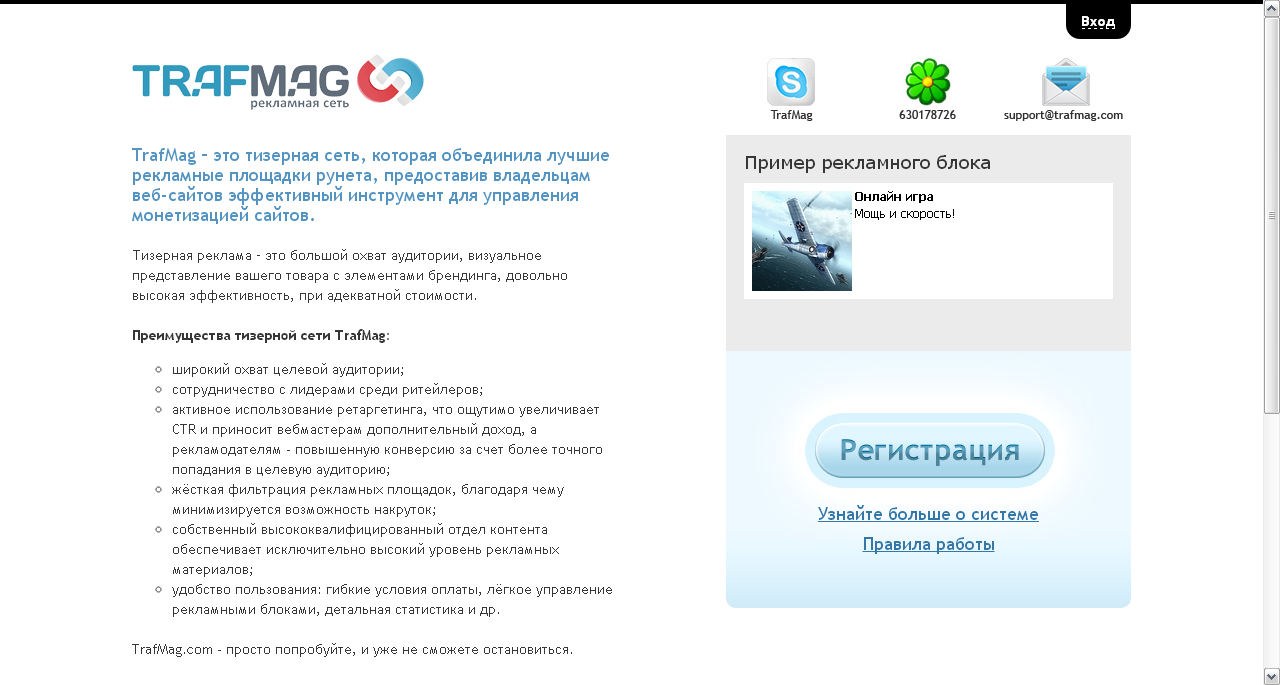 TrafMag – это проект, представляющий собой рекламную сеть, объединяющий самые качественные сайты рунета, и предоставляя владельцам площадок эффективный и удобный инструмент для монетизации своих ресурсов.