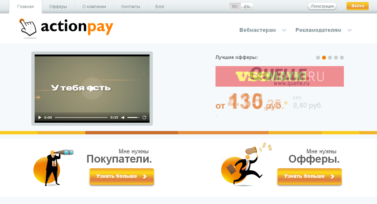 ActionPay это партнёрская сеть, стартовавшая в 2010 году и на данный момент является одной из самых ведущих CPA-сетей в Рунете.Работает с сайтами и площадками из соц. сетей (ВКонтакте, Фэйсбук и т.п.)