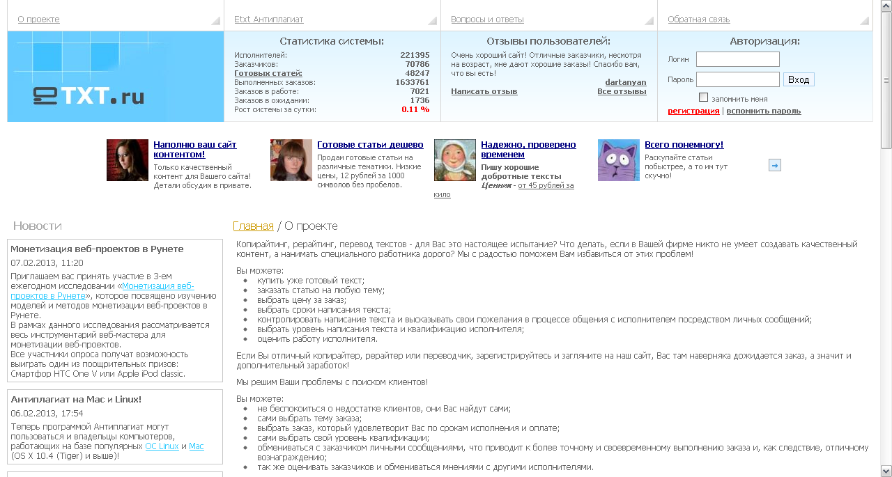eTXT является биржей статей, и предлагает такие услуги как копирайтинг, рерайтинг, переводы с одного языка на другой. Уникальный контент, который предлагает eTXT в перввую очередь подойдет для качественного текстового наполнения сайта, веб-журнала, блога и т.д.Если вы считаете себя копирайтером, рерайтером или переводчиком, то биржа статей eTXT может предложить вам работу на своем сайте.