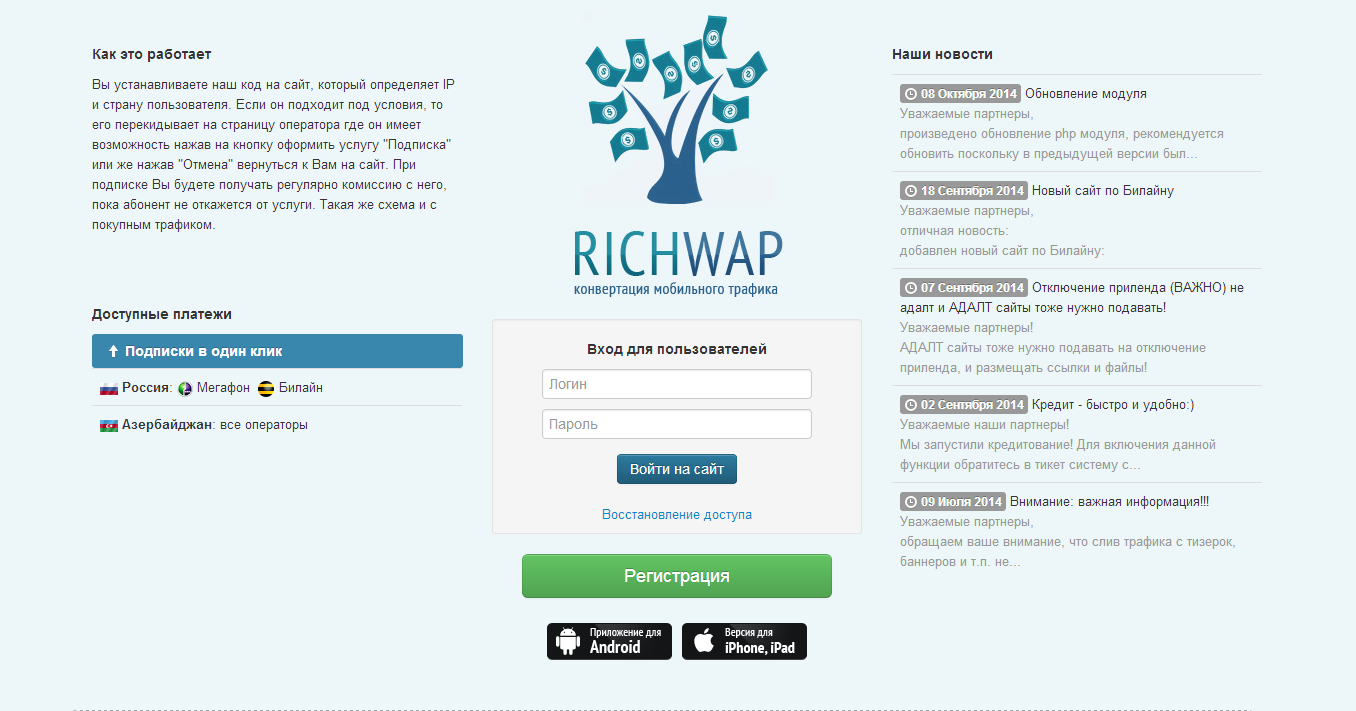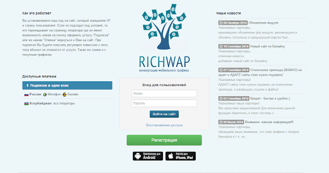 RichWap - проект, специализирующийся на на различных подписках в 1 клик. Для вебмастеров это отличная возможность монетизировать трафик со своих ресурсов, приходящий с мобильных устройств.Для того, что бы начать работать с RichWap надо выполнить всего 2 простых шага - зарегистрироваться на официальном сайте, получить в личном кабинете специальный код, с дальнейшей его установкой на своем сайте. Код, для быстрого его срабатывания, лучше размещать в шапке сайта перед тегом /head.