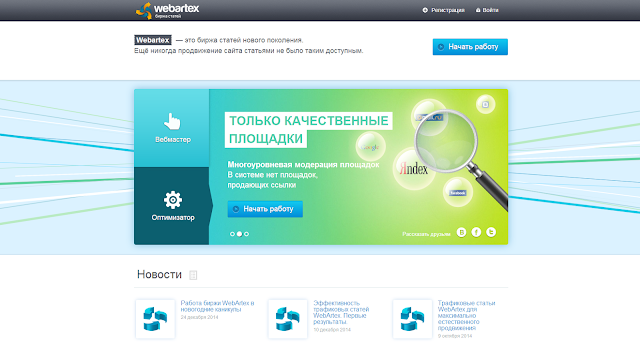 В настоящее время продвижение сайтов методом размещения статей достигло масштабных объемов, а значить в этой сфере крутятся огромные деньги, которые вебмастера могут с легкостью заработать. На кибер рынке не мало проектов, которые предлагают оптимизаторам продвинуть свои ресурсы в интернете, а вебмастерам заработать на размещение статей на своих сайтах ( они все представлены в разделе " Биржи статей"). В данной статье мы рассмотрим инновационный проект нового поколения WebArtex.Услуги, предоставляемые WebArtex - биржей статей, мы описывать не будем, т.к. нас в первую очередь интересует именно заработок, а не продвижение.
