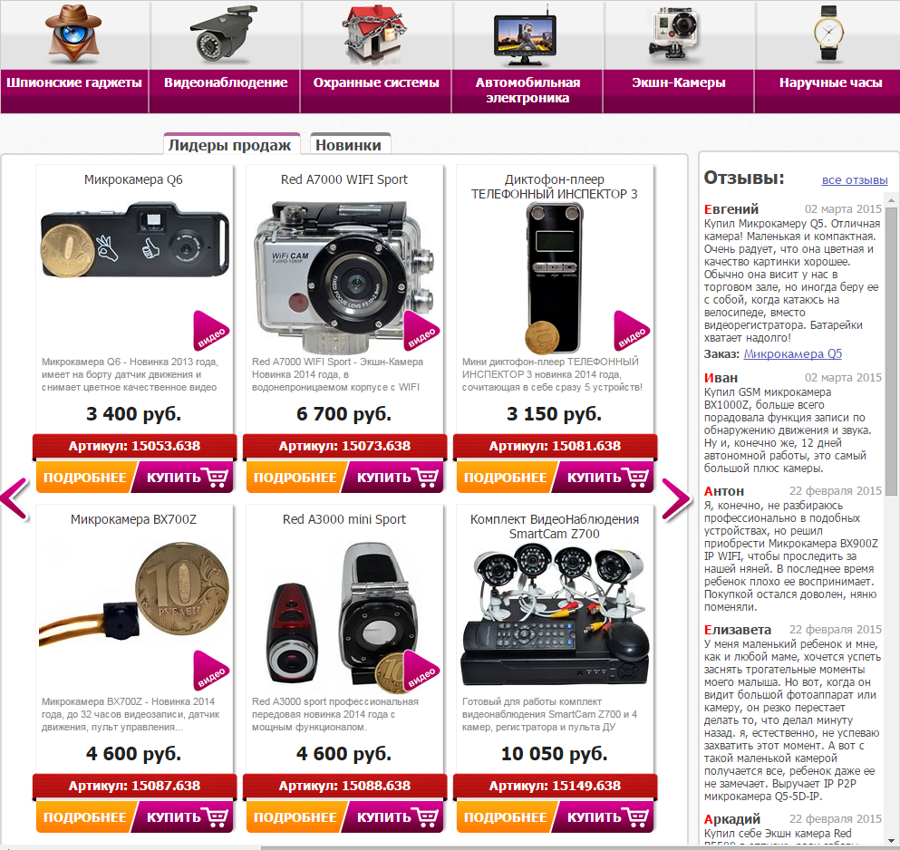 - Шпионские гаджеты ( микрокамеры, диктофоны, подавители сигнала, антижучки, видеоглазки, приборы ночного видения, и мн. др.).