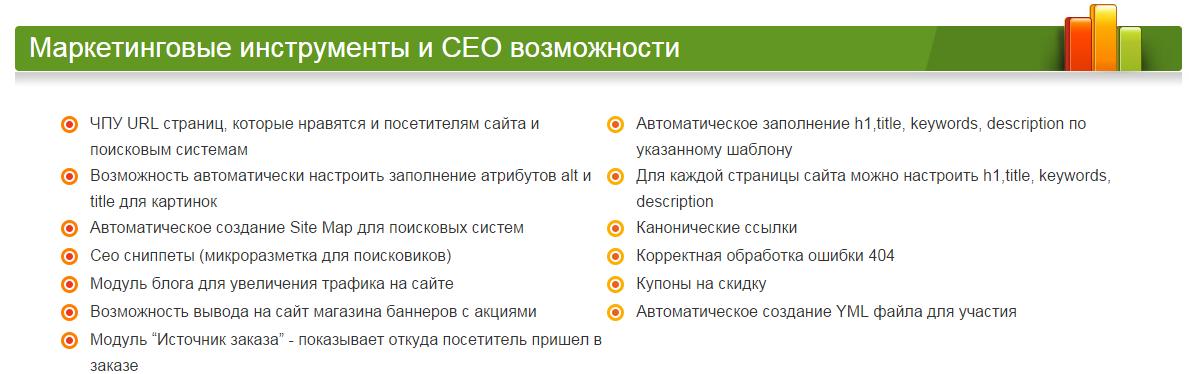 СЕО возможности интернет магазина и маркетинговые инструменты.