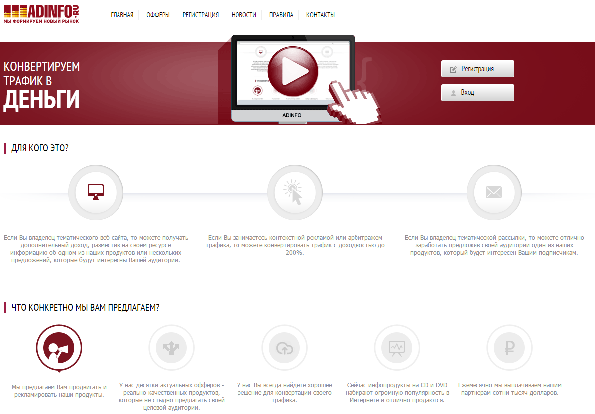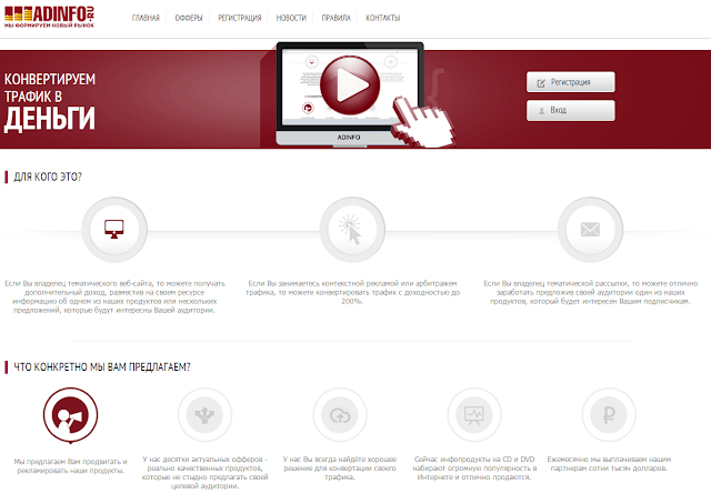 В настоящее время инфо-продукты на DVD и CD имеют большую популярность в Рунете и отлично покупаются пользователями. Именно такие продукты партнерка ADINFO и предлагает своим партнерам для продвижения и рекламирования.На официальном сайте вы найдете десятки самых качественных продуктов - офферов, которые будут актуальны для вашей аудитории.