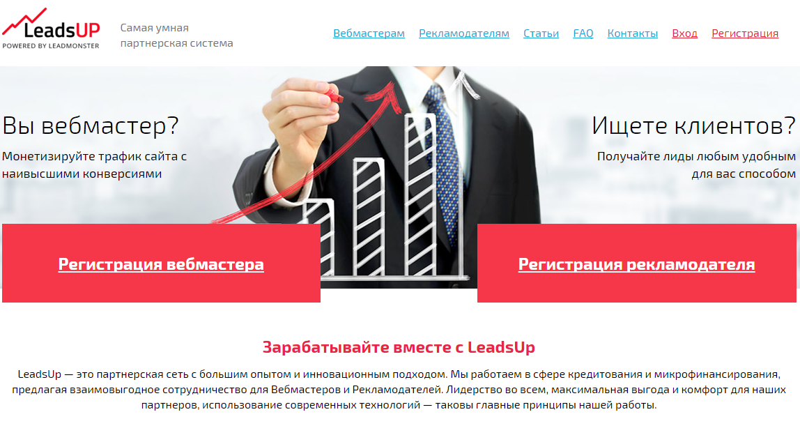 Партнерская программа LeadsUp — это сеть с инновационным подходом и большим опытом работы в сфере вкладов, потребительских кредитов, кредитов под залог, ипотеки, кредитных и дебетовых карт и микрофинансирования, предлагая взаимовыгодное сотрудничество как для Рекламодателей, так и для Вебмастеров.