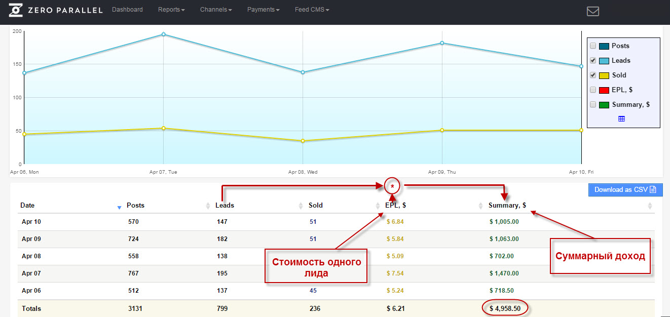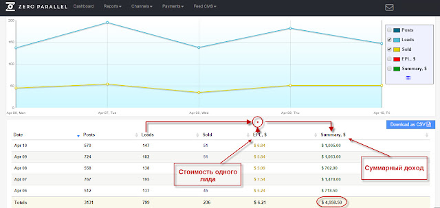Предположим, средний лид стоит 2.5 $, тогда мы можем вычислить степень эффективности конверсии тематического ресурса: