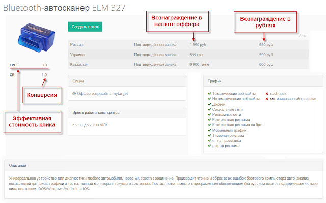 Рассчитать примерный уровень доходности партнёрки можно по параметрам, которые отражаются в описании оффера (см. скрин. ниже).![]() |