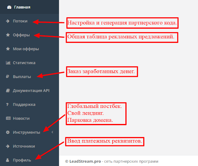 Leadstream использует принцип создания потоков для генерации партнёрских кодов, т. е. каждая партнёрская ссылка сопровождается целым блоком данных, которые используются для возврата трафика и формирования статистики.